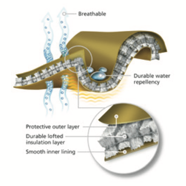 复合式构造,通过对功能性面料、隔热保暖层和不同技术的策略性分布,保持身体特定部位的温暖,同时又避免过多的汗气蒸腾和过多的热量积累。