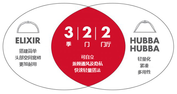下图可以清楚地显示出Elixir 2和Hubba Hubba NX帐篷的异同之处,这些特性是可以扩展到Elixir和Hubba全系列产品中的(单人帐、2人帐、3人帐和4人帐)。