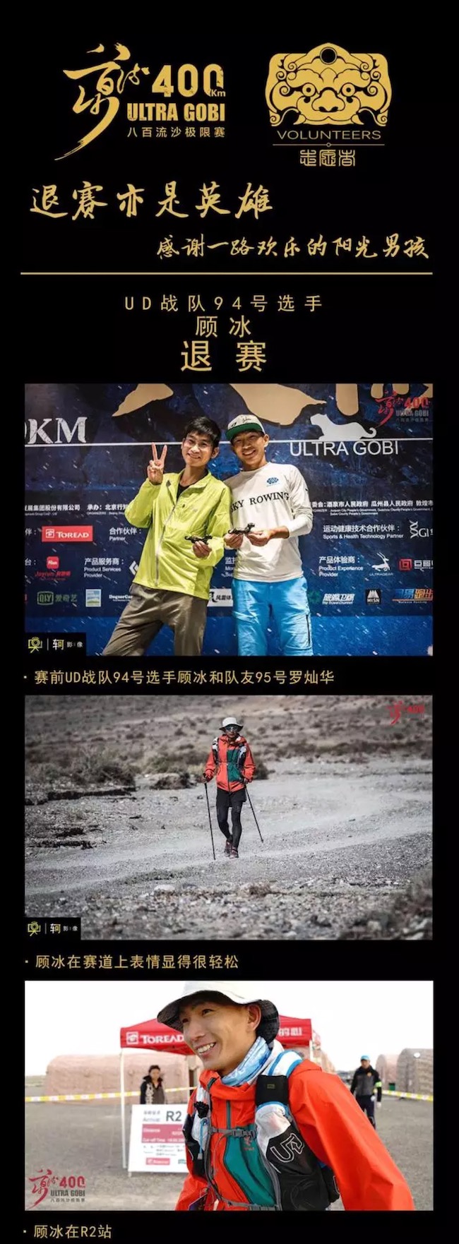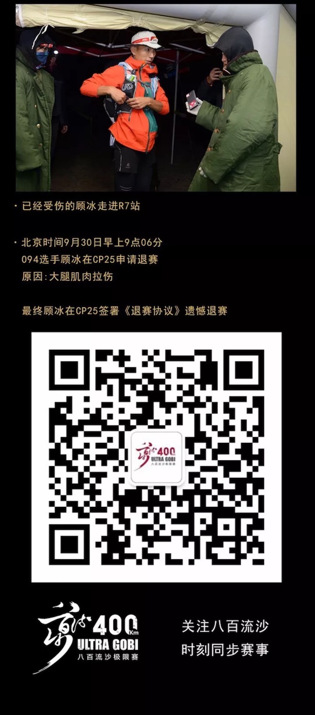 2017八百流沙极限赛最新报道:UD战队队员094号选手顾冰因大腿肌肉拉伤,于早上9:06分在CP25退赛。