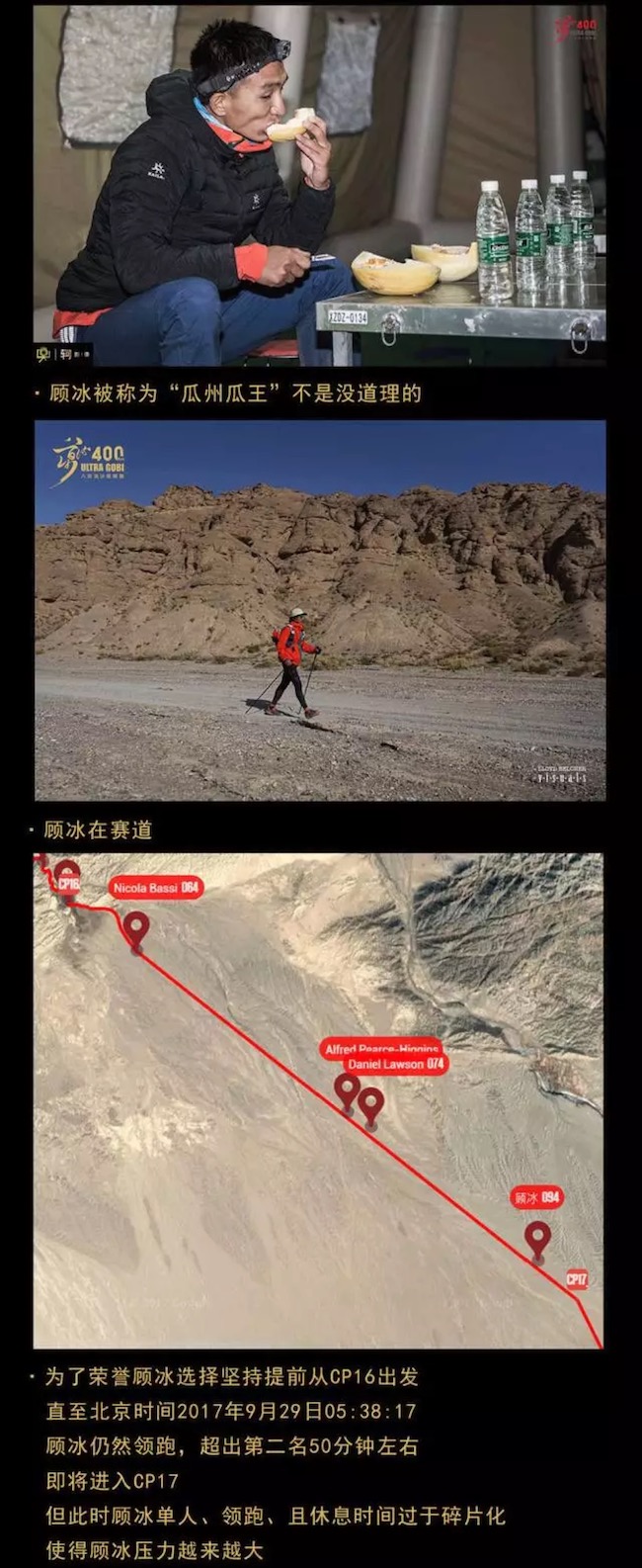 顾冰是本次八百流沙极限赛中方最有希望获得冠军的选手,开赛之后,顾冰的表现也验证了大家的预测——表现非常抢眼,在前250公里的赛程中,一直保持正第一集团的优势,在大多数时间都位于所有选手的最前方领跑八百流沙。