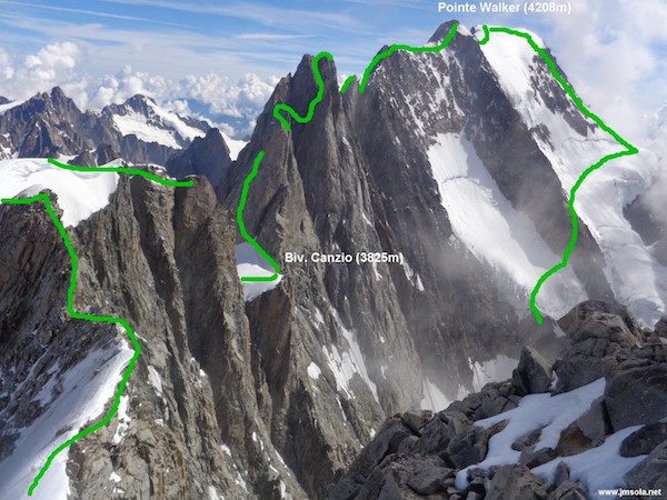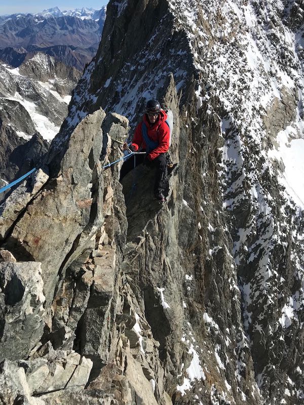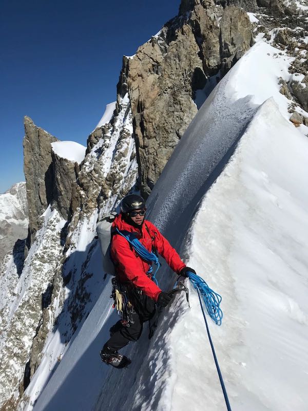 我和李爽去爬大乔拉斯山脊线路(Rochefort & Grandes Jorasess Traverse)难度D 5a 850m,2天。