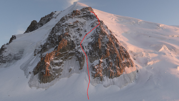 如果路线呈白色,说明雪很多,线路状况可能很棒,也可能很糟糕。很棒的情况是,雪比较多,而且沉降得很好,很结实,攀爬速度可以很快,路线下面的400米大多可以Running Belay。攀冰路段的冰况也不错,入镐碎冰的情况很少发生,攀爬速度也很快。可以在youtube上看TVmountain拍的这条线路,就是上述这种非常好的雪况,有如履平地的感觉。