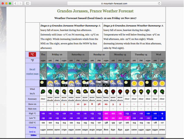 可以查询各种天气预报,比如霞慕尼,在霞慕尼官网上就有天气预报,分不同海拔高度预报。也可以查 https://www.mountain-forecast.com网站,