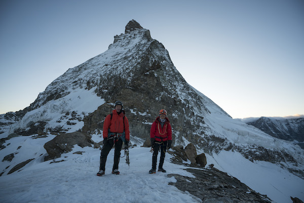 攀登结束后我和古古的合影,身后就是马特洪传统路线,也就是我们此次攀爬的下撤山脊路线