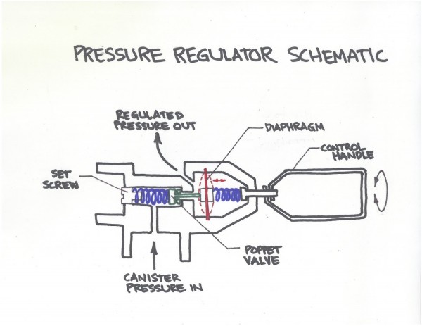 MSR的压力调节器位于阀门内,配有一个小的提升阀。该阀由一个小膜片控制,膜片不断将大气压力与朝向燃料喷嘴的压力进行比较。当它读取到压力差时,膜片会打开或关闭提升阀,以允许向气罐内压入更多压力或者将其切断。这样就确保了气炉的燃料喷嘴总是能够得到我们想要的精确的压力。