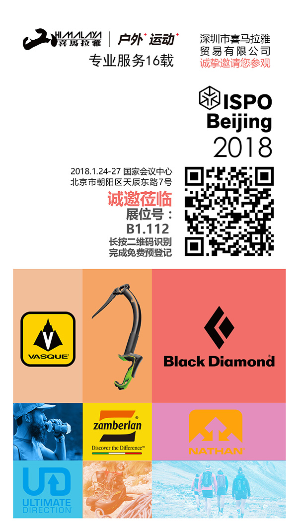 1月24日至27日ISPO Beijing 2018亚洲运动用品与时尚展中,深圳市喜马拉雅贸易有限公司将携旗下代理品牌和众多新品参展,展位号B1.112。