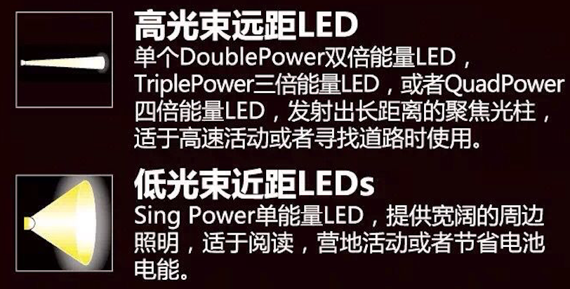 配备一个QuadPower四倍能量LED,一个DoublePower双倍能量白色LED,最大输出500流明,最大照明距离125米