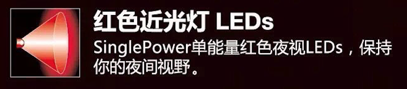 SinglePower单能量红色LED提供夜视模式,有近光和频闪两种设置,且不必绕过白光模式即可独立开启