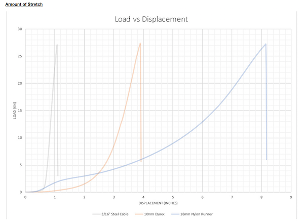 从曲线图中可以看出,钢缆直到在27千牛断裂之前,没有拉伸太多,也就1英寸多一点。Dynex 拉伸量是钢缆的几乎四倍,在同样的荷载下断裂。是的,Dynex 比钢缆延展性好。然后再看看尼龙,它的拉伸量是Dynex 的两倍,钢缆的八倍,断裂强度都差不多。