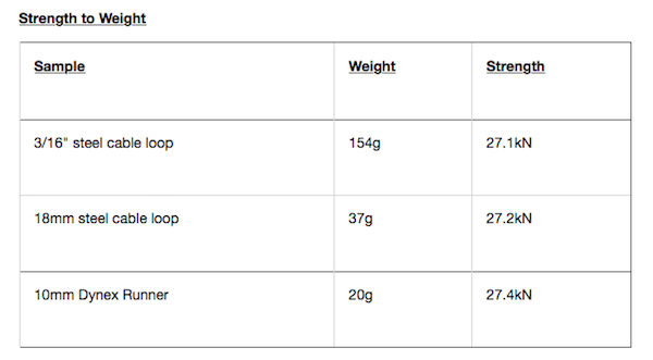 人们说Dynex 跟钢缆一样结实。在此次检测中,这个结论是正确的。这条60厘米的机制10毫米Dynex 扁带圈,重量大约只有20克,断裂强度却超过了27千牛。作为比照,3/16”钢缆的重量是154克,在差不多同样的力度下—27千牛多一点—被拉断;而60厘米机制18毫米扁带圈重量是36克,断裂强度也是27千牛多一点。