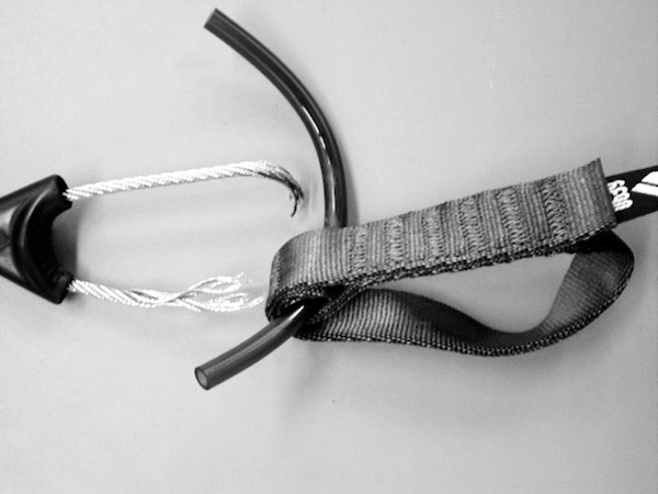 我又一次从办公室的地板上捡了一条扁带。我不知道它从哪里来,或者说以前做什么用的,可能是背包束带,或者滑雪裤的腰带,或者什么什么的。我们打了个水结,它承受的荷载大约14千牛。还不错,但比18毫米尼龙打结制作的扁带圈和机制扁带圈差得远。