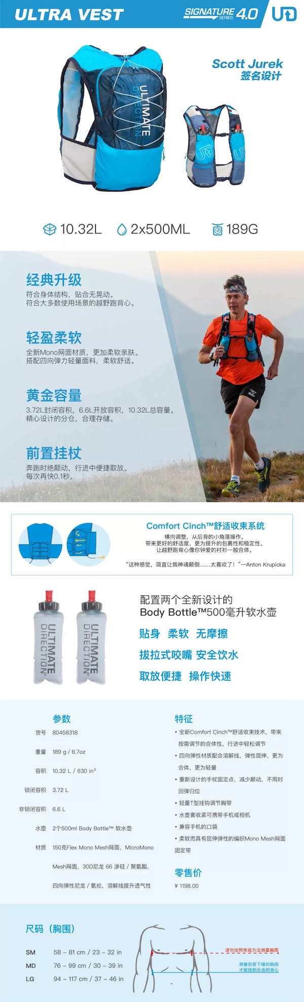Scott创造的这款技术性跑步背心,既适用于普通跑者,也为世界最佳选手所钟爱。因此,SJ ULTRA VEST成为世界上销量最佳的越野跑补水背心。