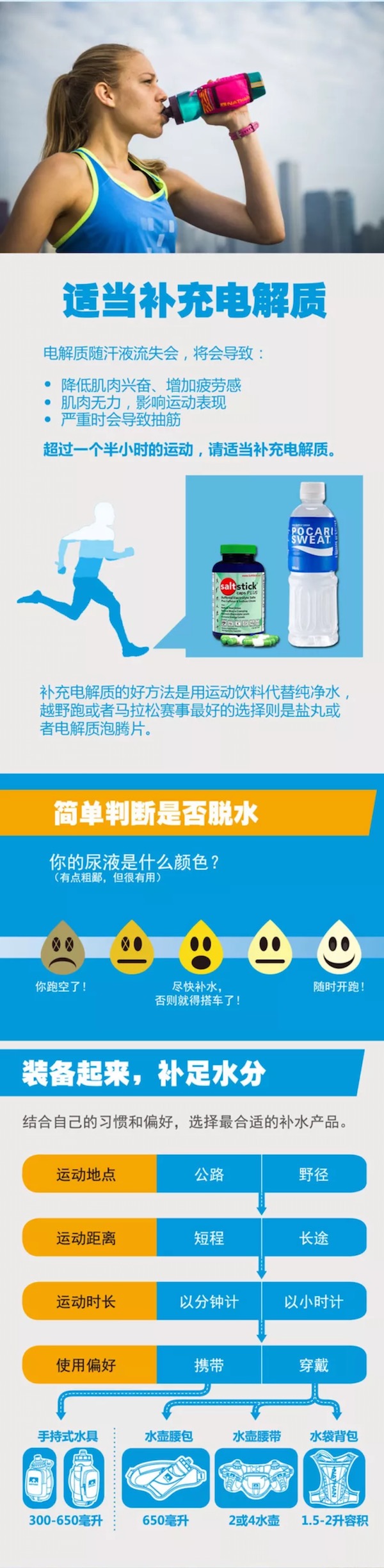 注意水分的摄取。起跑之前喝足量的水。放心,水会排出,不会造成水肿。不要担心停下来喝水,自己会慢下掉队,适当补水,能让自己跑得更远更快。