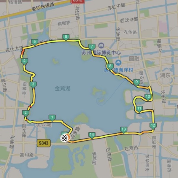 环金鸡湖线(含环洲路约15公里):浆果跑者店铺(起点)-李公堤-星州路-现代大道-文化艺术中心-右岸街-星湖街-环洲路(约2公里)-金鸡湖大道-浆果跑者。