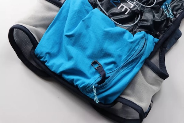 我选择前侧拉链口袋存放手机,另侧配合塑封袋储存垃圾,水壶仓外侧口袋塞入 4 条半程取用的能量胶。其余 4 条能量胶则和头灯一起装在背面拉链仓内。(依据预计完赛用时,老蒋配比了 1.5 小时一条能量胶的补给)