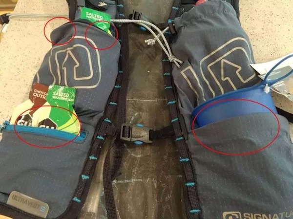 像我这样的吃货(完全靠吃拿下一个个的比赛),补给装不下的话也没有关系,后背同样面料的口袋也是触手可及,跑动中很方便地可以完成拿取的动作,非常方便。