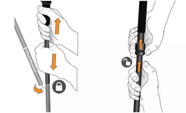装配时,一只手握住手柄,另一只手握住下方杖身,以反方向对拉,直到 SlickLock 卡合入位,锁定图标完全显现。现在,手杖已经锁定,可以动身了!