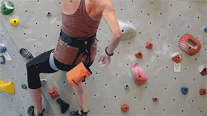 使用腰带也会让镁粉袋更贴近你的身体,这很重要。尤其是攀爬大角度陡峭线路时,镁粉袋会悬垂离开你的身体,这种情况下抹镁粉时手就需要够更远,导致进一步将重心拉离岩壁,上肢要承担更大的压力才能让自己保持停留在岩壁上。陡峭线路上抹镁粉意味着身体重心的显著移动和更为危险的力道。