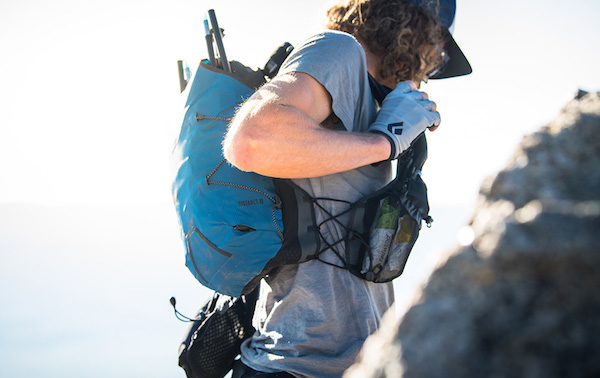 我使用了BD 的8升Distance 越野跑背包(19春夏上市);在包里,我装了一条150克的保暖裤,90克的保暖坎肩,BD FineLine 防雨服,BD羊毛保暖帽,BD Mont Blanc 全指手套,还有iPhone手机。后部口袋中装着BD Distance 防风夹克(19春夏上市),有点寒冷时非常管用。