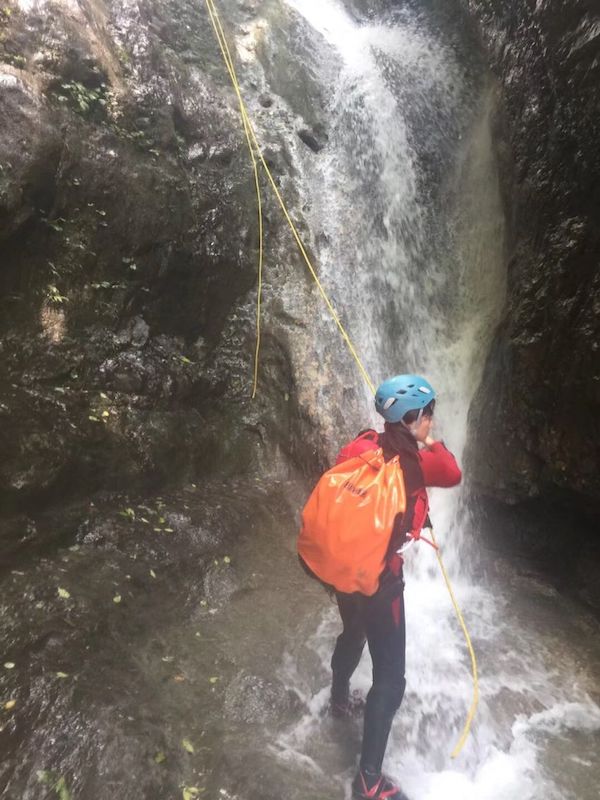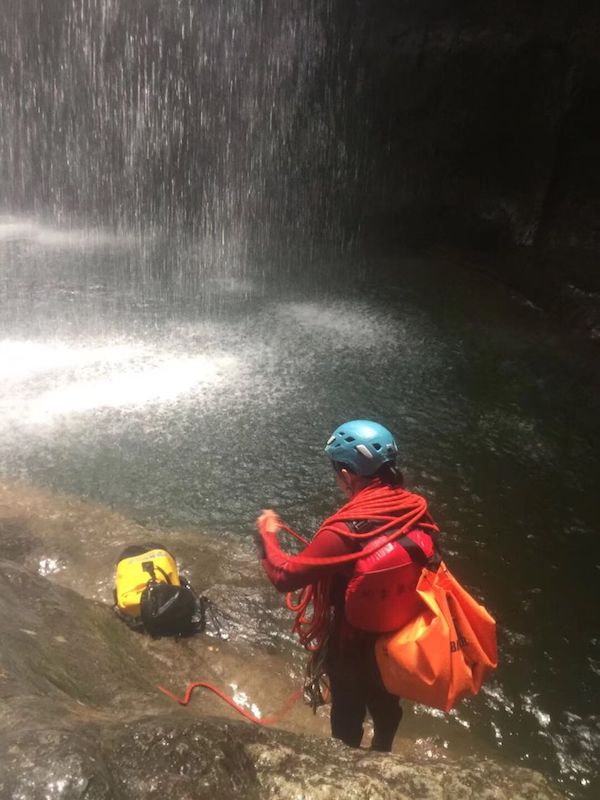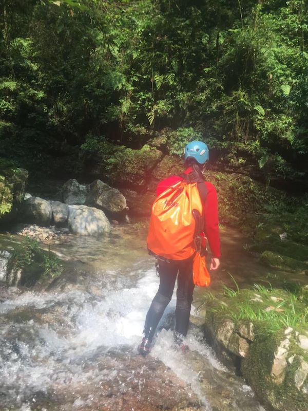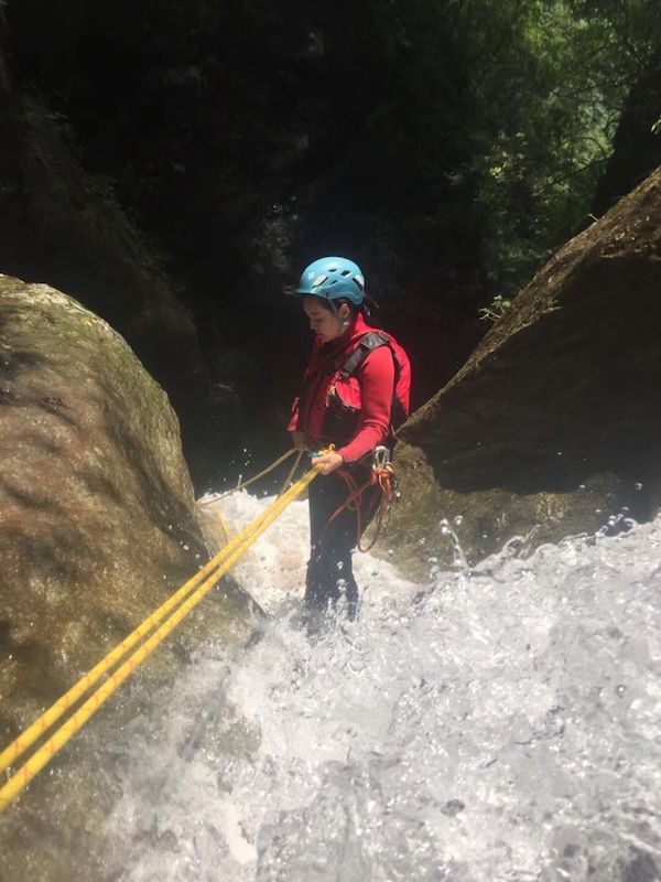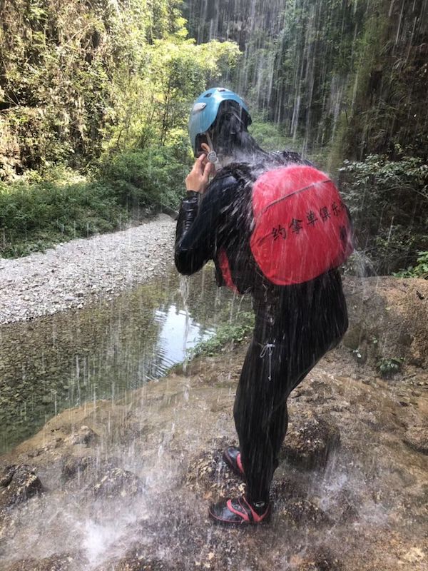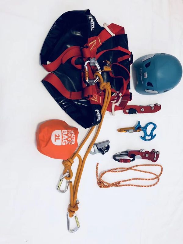 头盔是溪降中必不可少的装备,其意义不仅在于防备落石,溪降中的地形复杂而湿滑,摔跤、滑坠都可能导致头部的撞击。