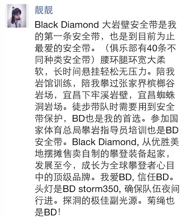 “一直以来,都是Black Diamond 的忠实粉丝。登山杖,头灯,粉袋,攀岩安全带等等。产品颜值高,质量扎实。