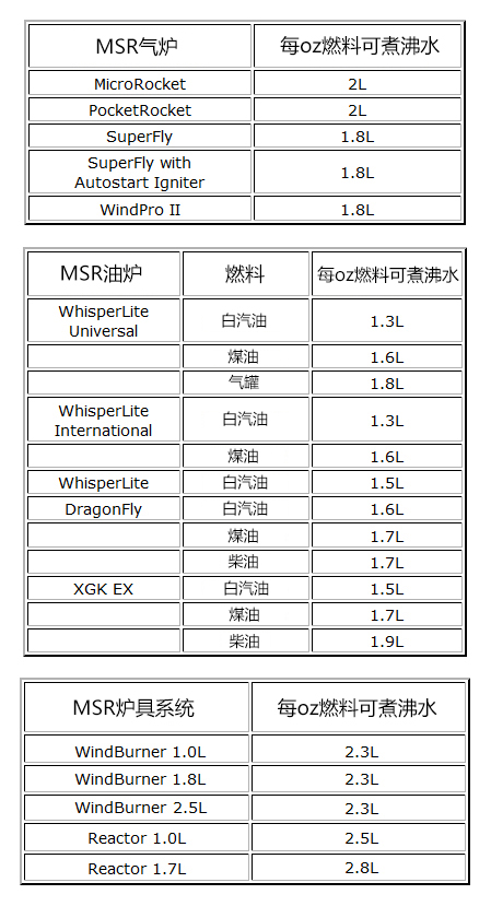 完成这个估算后,使用下表确定您的炉具煮沸1升水所需的燃料量,然后计算出消耗燃料的总量。请记住,这是一个粗略的估算,是供您增加调整的基数。