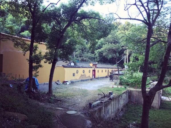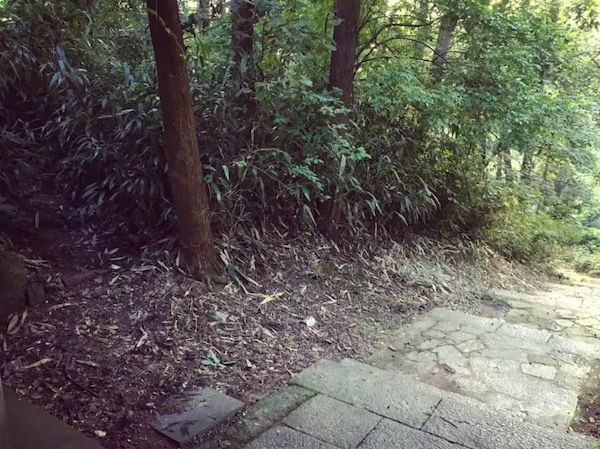 一段小土路爬升之后,我们来到栖云寺,是南宋时期的皇家寺院,该寺背枕栖云峰,门对钱江潮,也算的上是杭州的古刹了(距离起点 2.8km 左右)。到了栖云寺门口,我们下台阶,再转面对寺庙右侧台阶而上,进入乱石古道。