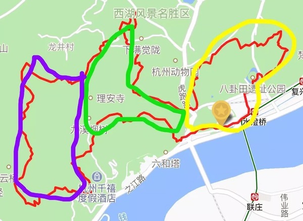 2018 VASQUE杭州西湖跑山赛赛道全程 28km,累计爬升 1750m,起终点均是白塔公园。由于赛道测试分别由三人分担,我负责的是中间这段,为了凑成环线,实际测试的是赛道的 7.6km - 14.6km(虎跑路口-虎跑后山-水乐洞-烟霞洞-翁家山-九溪)这段和 23.5km - 28km(林海亭-终点)这段,中间直接从九溪路口沿公路切到了林海亭(约 2km ),总计 12.6km 。