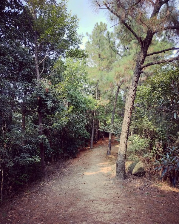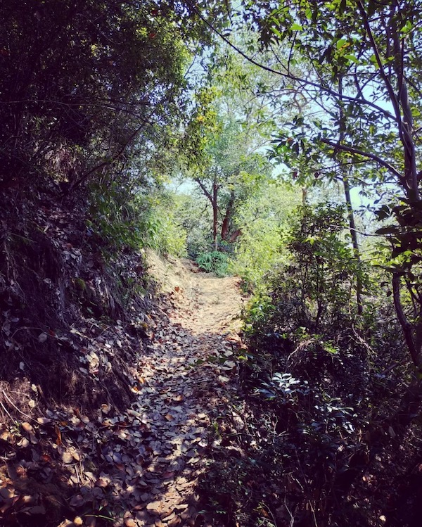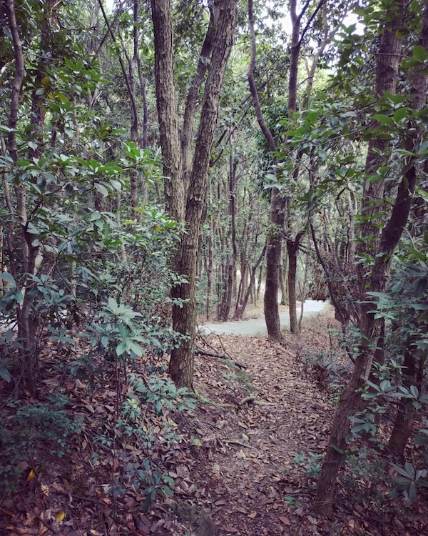 游步道往前几十米之后会遇到一个分叉,右侧是往山顶的,赛道路线是往左侧走。
