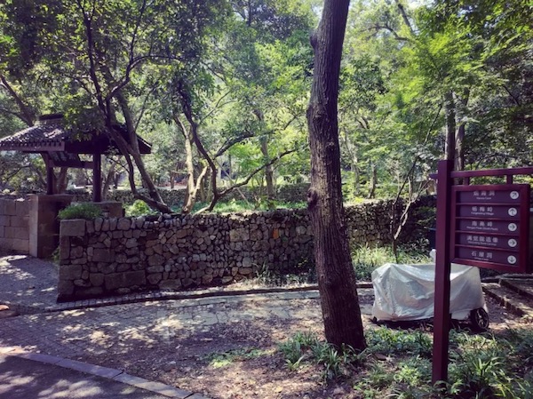 从虎跑路口开始是一段公路,在树荫下沿着公路跑大约 1km,看到这块石头就开始进山了。这个地方一定要右转,不要傻fufu 的和我一样往前傻跑。