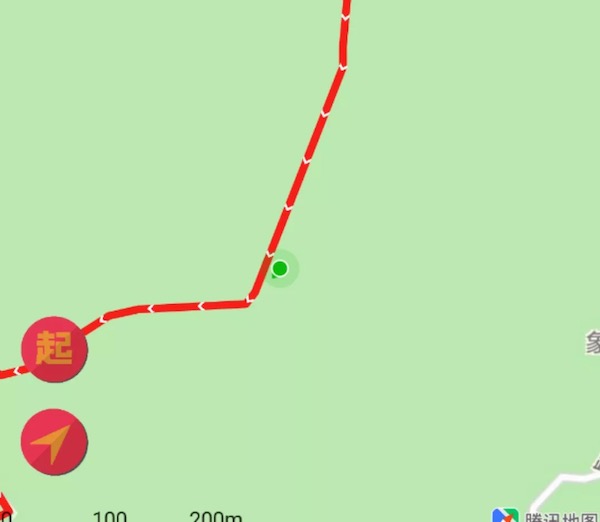 在快要跑出茶山时候遇到困难了,由于本次测试是自导航,因此遇到一个分岔口,选择向左走还是向右走成了难题(正式比赛时候有路标,不会遇到这个难题)。如图,我当时位置是在绿点处,应该是向前一小段再右转。