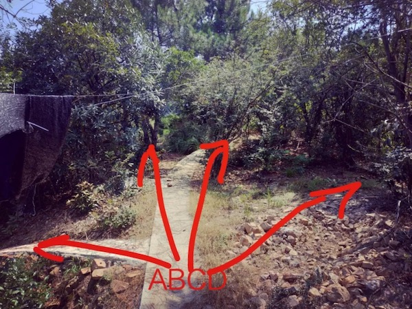 你会选择哪条路呢?老师说,不会的题目优先选C,于是我选了C。很快发现小助手的轨迹显示正确的路线在右下方,只好从树林中间硬切下去。回到了D这条正确的土路。这段土路非常松软,跑起来一点也不费劲。