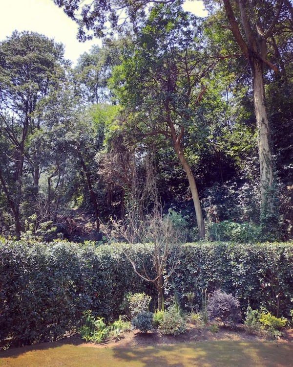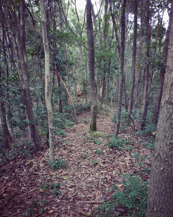 我想当然的沿着去年的赛道往左前方跑了进去。跑出去一会手表提示偏航也没理会,还觉得这提示只是定位误差引起的。再往前跑,看着偏航越来越大,才确认自己是跑错了,赶紧回头,回到和轨迹重合的地方,就是大石头这儿。然后右转,老老实实看好了轨迹往前走。按照轨迹往前走了一段之后应该是左转上山了。可是没有明显的路,边上有几条疑似的小路,都走了一段试探一下,都不对。环顾四周,没有其他路了啊。于是后退几步,对准了轨迹前进的方向,终于发现原来是此处多出了一排密密的树,把上山的路挡住了。