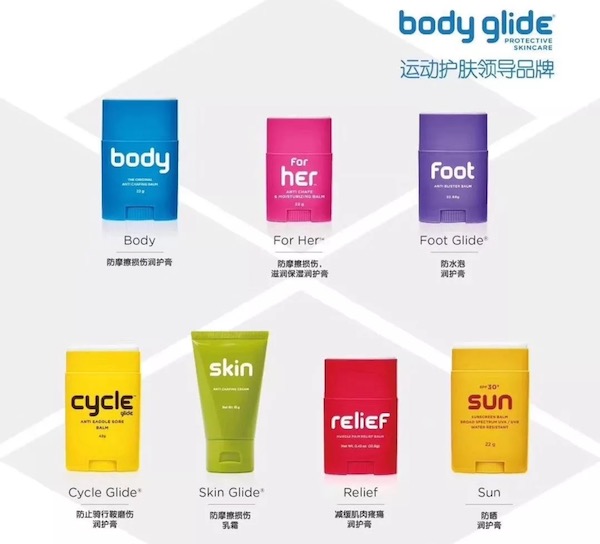 Body Glide 是一个标志性品牌,在这个品类中,1996 年,Body Glide 开创了用于跑步和运动的防护型护肤品,有用于运动的防磨膏、防晒霜、按摩膏,以有效、安全、洁净、低过敏性、舒适的产品为你提供看不见的防护,帮你对抗擦伤、日晒和疼痛。