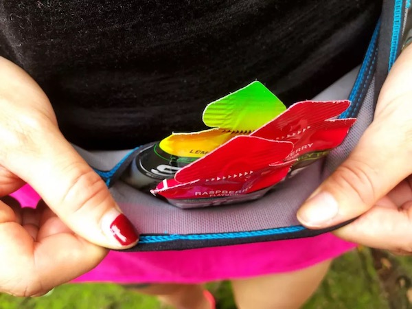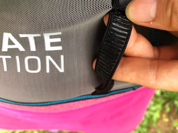 前左右侧都有 3 个细弹力绳,可以绑上能量胶以及一些轻便的外挂装备。