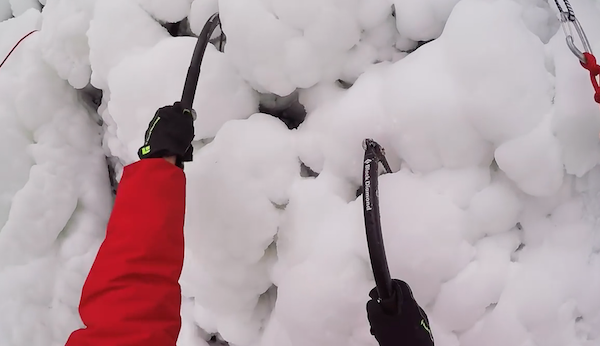 这个新款铲头Spectres 冰钩,可以用在冰质非常软的路线上,我用它安全完攀了尼亚加拉冰瀑;同时也一直在思考,“这些家伙还可以用来爬什么呢?”当我凝视Helmcken狂野的喷溅冰线路时,我知道答案了:用尼亚加拉冰钩,加上BD 全新的Ultralight 超轻冰锥,以及所有我能找到的可以用得上的器材!
