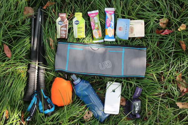 整个腰包共有前后两个主仓(22cm x 11cm) 和两侧两个副仓(15cm x 11cm)构成。顶部的4个挂绳可以放置能量胶或者挂号码簿,后面两根黑色的弹性束带则可以安放折叠登山杖以及轻便夹克。在主仓内建议放置大件物品如:手机、500ML软水壶、能量棒、头灯等。