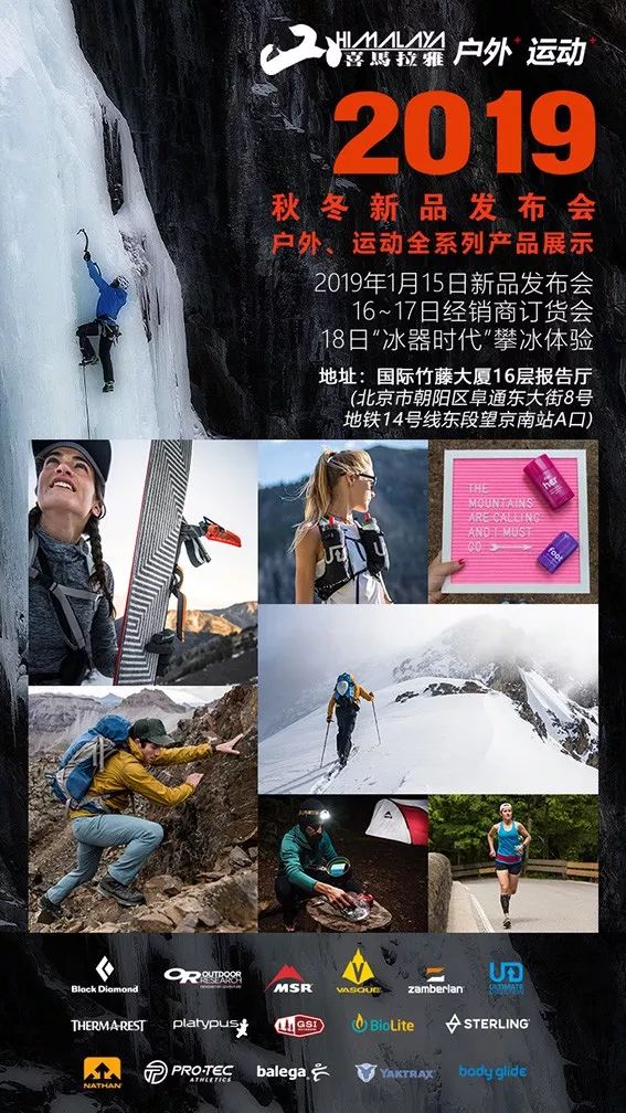 1月15日至17日,发布会上的2019秋冬新品以及深圳喜马拉雅公司旗下近20个户外、跑步品牌的全系列产品,将面向全国经销商,户外、跑步组织,专业观众等开放展示,参观者可以在现场体验众多新品,获得第一手的产品资讯。18日,“冰器时代”攀冰体验活动将在北京密云举行。