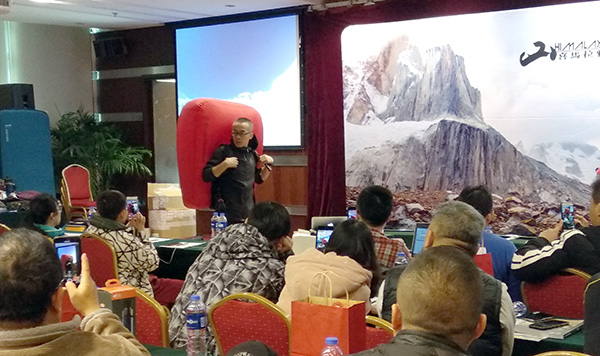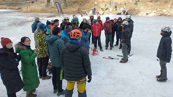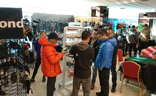 到场的二十名经销商伙伴大多数没有亲身体验过被称为“冰壁探戈”的攀冰运动,深圳喜马拉雅公司副总经理赵凯、Black Diamond品牌总监康华对大家进行了攀冰装备、攀登技术培训。