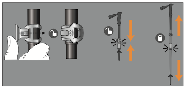 要展开手杖时,拉开下截杖身,直到听到SmashLock 机制咔哒一声卡合入位。调节上部的FlickLock关节锁,手杖锁定完毕,可以动身了!