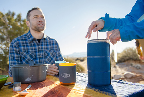 在露营营地,若有一杯浓香咖啡在手,定能赶走一天的疲劳。GSI Outdoors提供滤压、滴漏、蒸馏三种户外咖啡制作器具以及咖啡研磨器、咖啡杯。在这款滤压壶中放入咖啡粉,倒入热水,静置三四分钟,一压就能品尝到地道的咖啡。