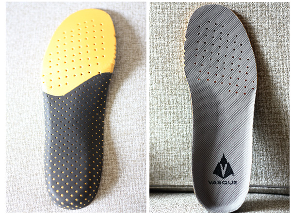 鞋垫采用活动可抽取的方式配置,可以从鞋中取出进行清理。鞋垫表面的网纹面料增加了鞋垫与脚底的防滑性能;同时正反面的气孔增强了透气性,也可以有效的进行排气排湿,保持双足清爽。这个对于汗脚人来说,调节效果明显。代表着“山”形的Vasque logo,美观大气。