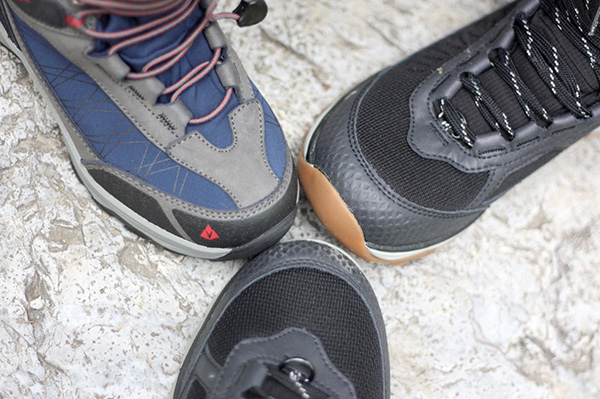 三款产品均为高帮保暖设计,缝制做工很细致,各个细节处理到位,整体采用了拼色设计,增强了产品的时尚感。不同材质间的连接缝制,均采用了双针缝线,牢固度更强。成人款重量为1030/838克,童鞋的重量仅为642克。