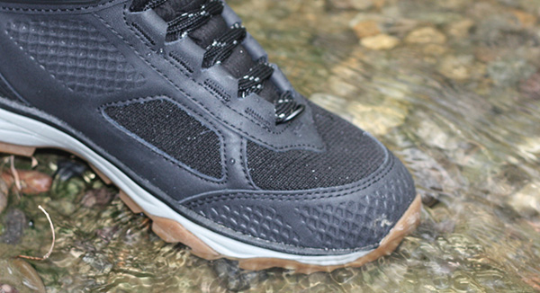 实测过溪水时候,对水的阻隔效果明显,水珠并未发生渗透,并且滑落顺畅,保持脚部的干爽。
