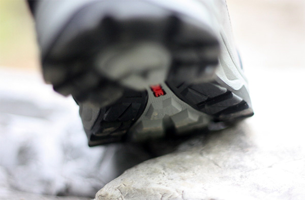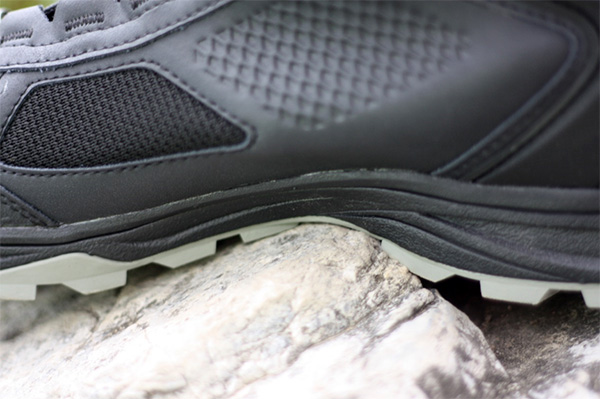 鞋尖的防撞橡胶,在实际使用时,能够明显感觉到鞋尖在对石头的撞击时候,撞击的强度变低,说明防撞橡胶起到给足尖提供保护的作用,能满足户外各种环境的安全需求。