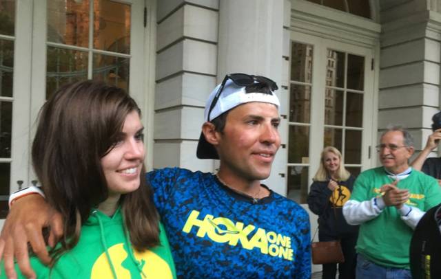 同时,Dale和Hart也要开始休息了,无论是在帐篷里还是在车里,他们在下一个早上三点钟之前急需一些睡眠和休息。然而,Phan很可能还醒着,脑子里还在想着第二天的线路,以及回复电子邮件,检查每一个细节。终点线和一个新的吉尼斯世界纪录在她的掌握之中。这个日子终于来了:当地时间10月24日下午17点半,Pete Kostelnick终于走上了纽约市政厅的灰色台阶。至此,这位29岁的超马跑者历时42天6小时30分完成了跑步穿越美国的壮举,这个成绩一举打破了尘封36年的吉尼斯世界纪录。