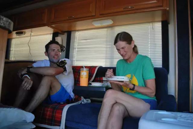 可能是只有一个人在跑步,但是这和整个团队是紧密相连的,及时的补给与后勤保障才能让Pete更专注于在规定时间完成计划的路程。整个团队每天15-18个小时坚守在狭窄空间的房车里或者驾驶另一部车完成此次穿越旅行。房车主要供Pete休息和恢复。其他成员在帐篷里睡觉,或者在车里,偶尔也在汽车旅馆。在休息的这一方面,安逸并不是优先考虑的问题。