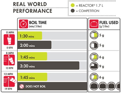 反应堆极度防风,所以才被称为“烧水神器”。来看看这张反应堆与某竞品在不同风力环境中烧水时间的图表,在无风、2级风、3级风环境下竞品的烧水时间无限延长,反应堆则无明显改变。所以,越是在刮风、寒冷的户外环境里,越能体现出反应堆烧水最快、燃料最省的性能。