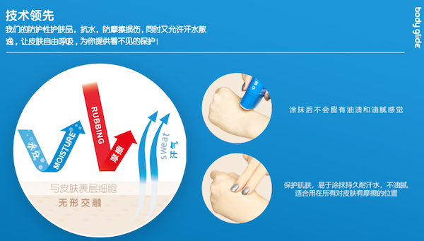 去年UTMB PTL 中国参赛队操山派的竞超是这么说的:以前跑步经常磨大腿内侧和胸,自从使用Body Glide之后这种情况就没再发生。PTL出发前先将Body Glide涂抹在大腿内侧和胸前,一路都没有磨。第二天过一段碎石横切路面时,感觉脚底板火辣辣要起泡,赶紧抹上防磨膏,很好的降低了水泡反应。
