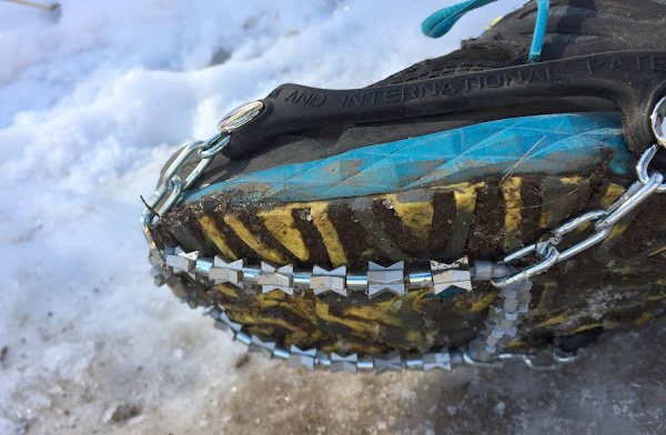 冬季户外徒步,有时会遇到硬冰、积雪、岩块、碎石、砂土等多种路况的混合路线,如果所穿冰爪在鞋底位置上有大量橡胶部件就有磨损的危险,在非冰雪路面上最好把冰爪从鞋子上摘下来。这样频繁操作,既麻烦又影响行走速度。此时,您需要一对Yaktrax Diamond Grip轻量冰爪。